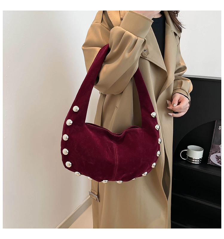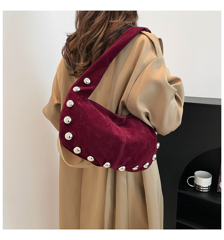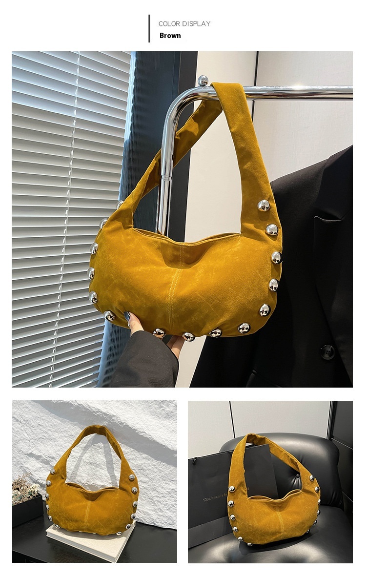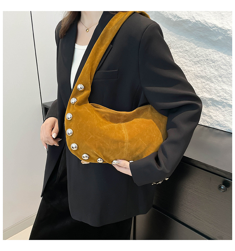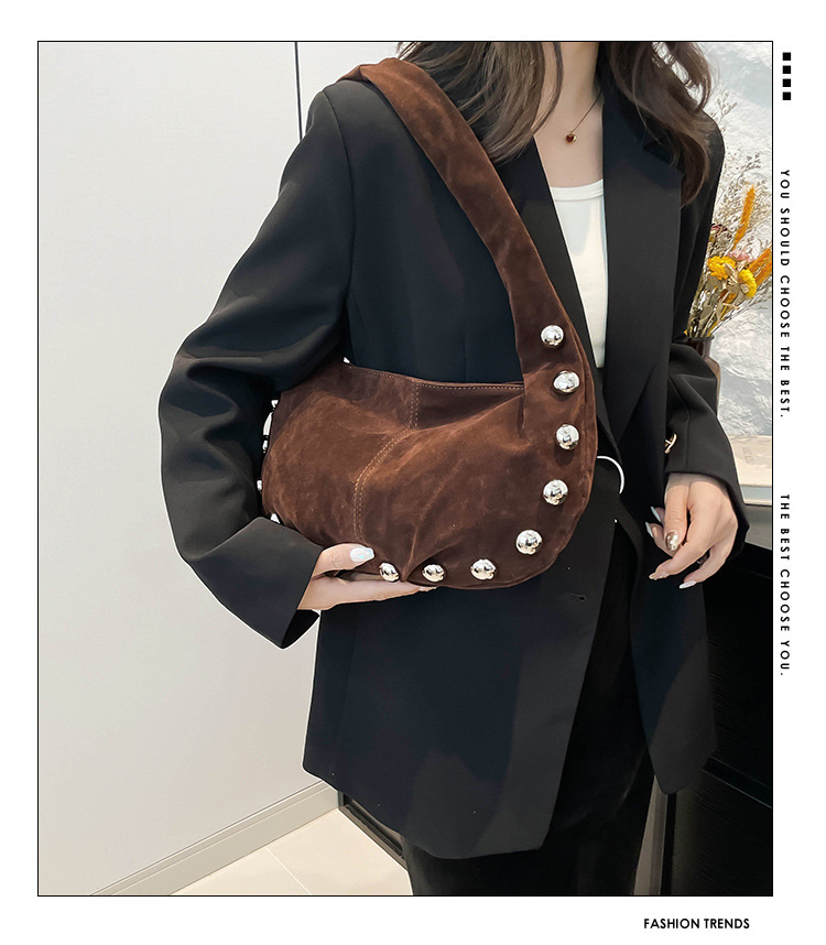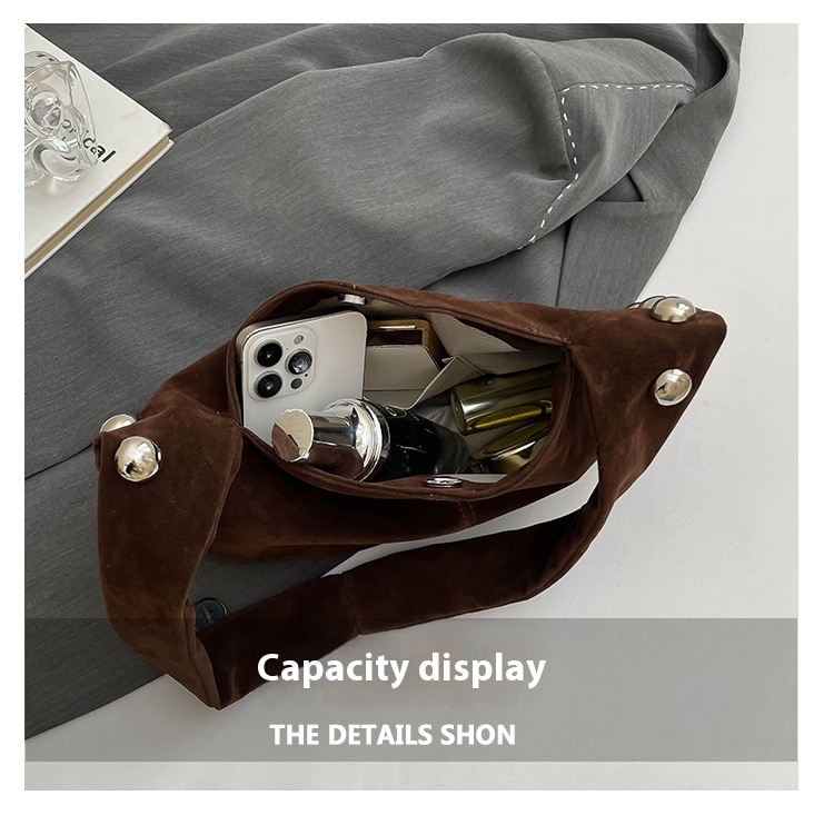 Alliez style et modernité avec ce superbe sac hobo en daim brun, orné de boutons métalliques argentés qui lui donnent une touche audacieuse et chic. Sa texture douce et sa forme souple apportent une allure élégante tout en restant décontractée, parfaite pour le quotidien comme pour une sortie stylée.